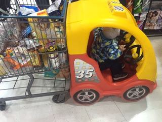 Saturday morning it was a cold and rainy day! But we packed up and headed to the grocery store. I didn't go to my usual store as I wanted to go to one that has a "car cart". Sam drove all around the store and for once, didn't throw things off the shelf.